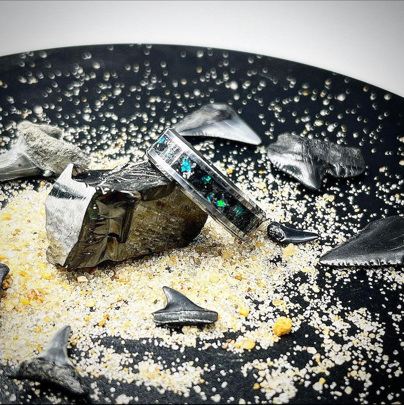Dive in with this Classic Series Ring named, "Ocean Depths". This stunning ring is crafted from ethically sourced shark teeth collected naturally from Myrtle Beach. The base layer consists entirely of crushed shark tooth and diamond dust. Next, we showcase a captivating blend of shark tooth fragments—including Bull, Tiger, and Lemon shark teeth—set against a backdrop of shimmering synthetic opals that flash vibrant blues and greens, reminiscent of the ocean.