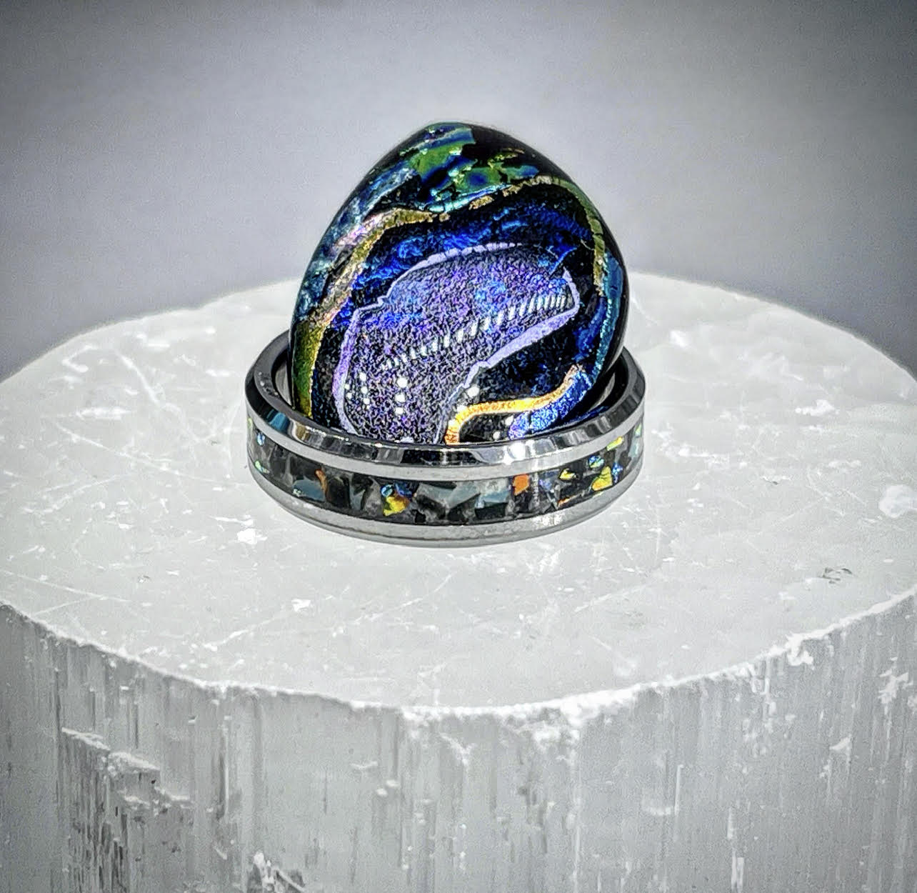 To complement the mesmerizing glass, we blend it with vibrant mica powders, glow powders, and synthetic Bello Opal, creating a captivating interplay of colors and light. The design is further enhanced with dichroic frit flake, melted copper, and delicate accents of 24k gold flake, adding a touch of luxury to this one-of-a-kind piece. Each ring is a celebration of artistry and individuality, perfect for those who appreciate the beauty of handmade craftsmanship.