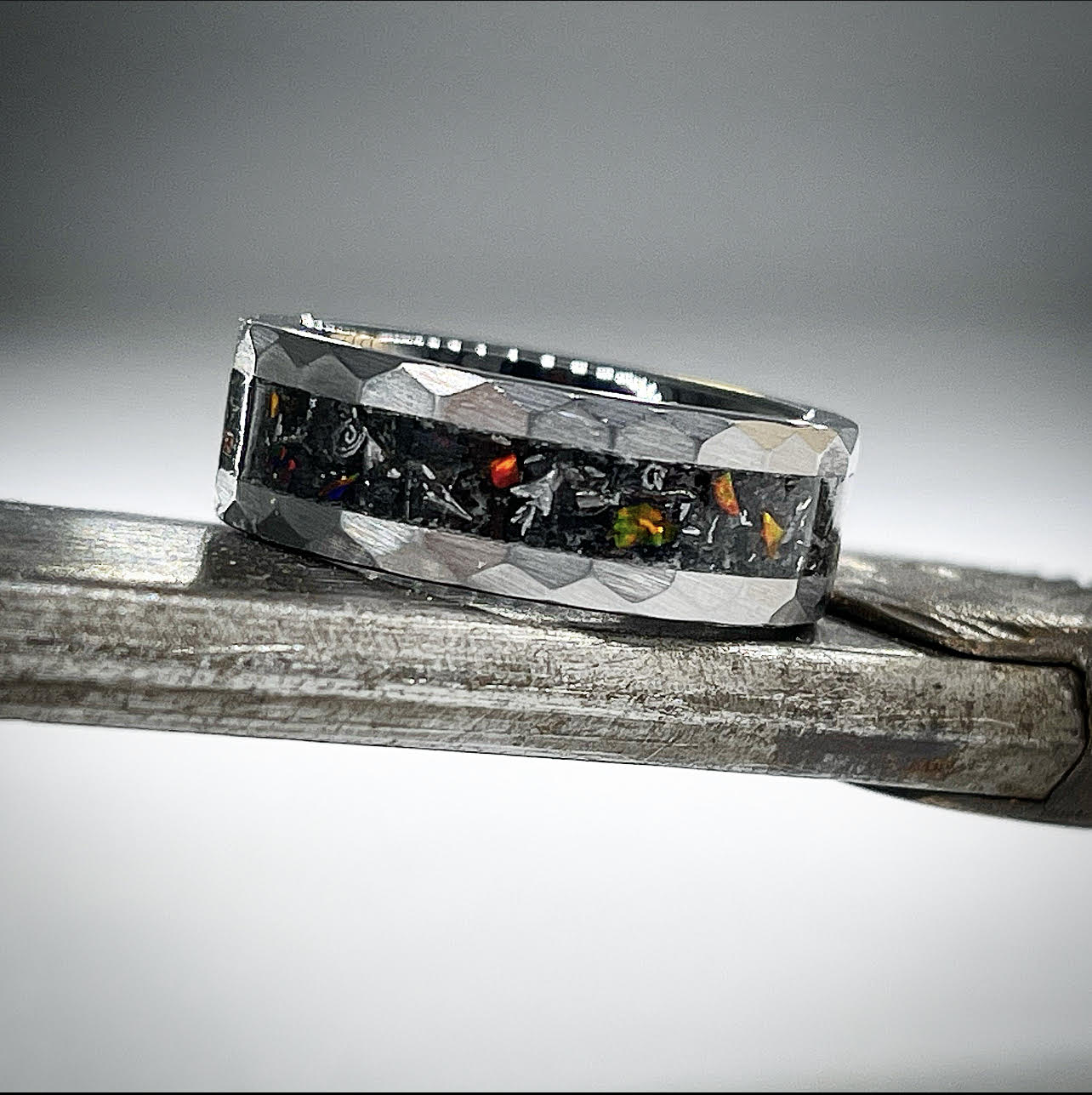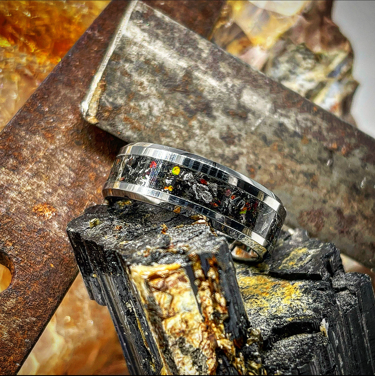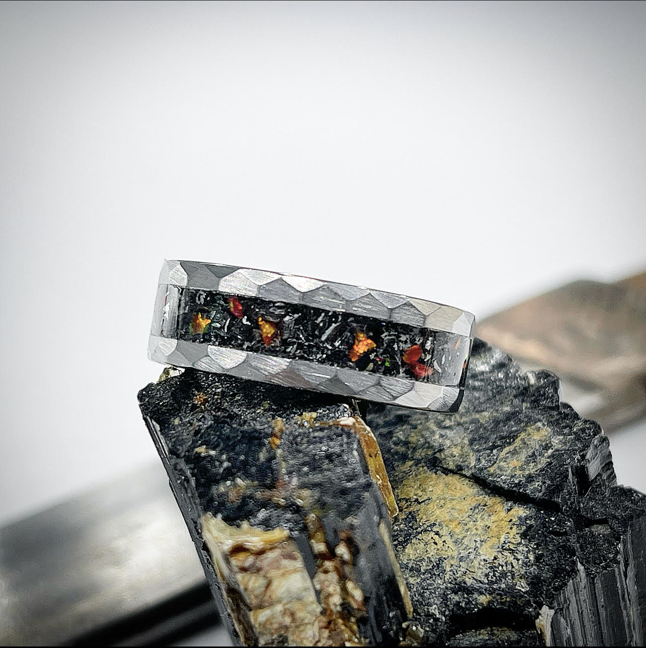 The Japanese Samurai Sword ring named "Forged in Fire" from our Classic Series is handcrafted from an extraordinary selection of materials. The base layer features crushed black tourmaline, diamond dust,