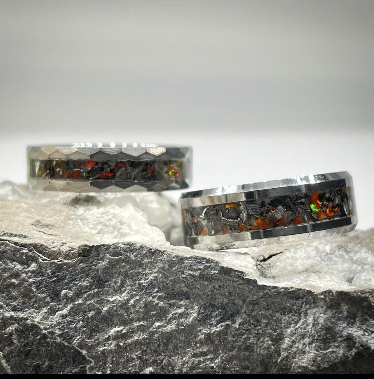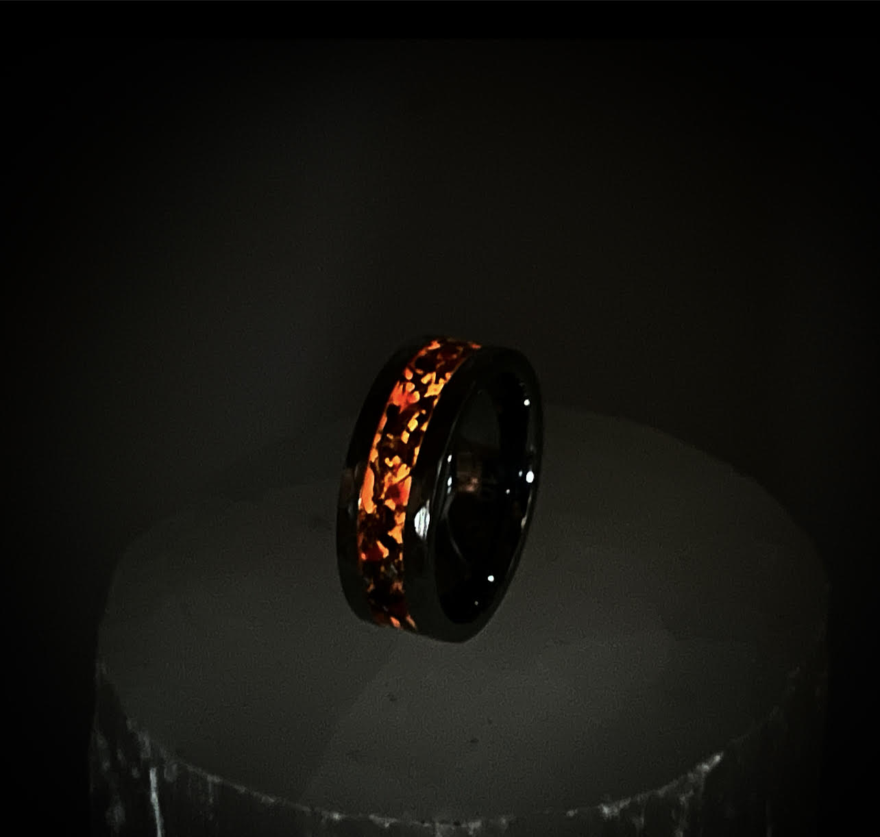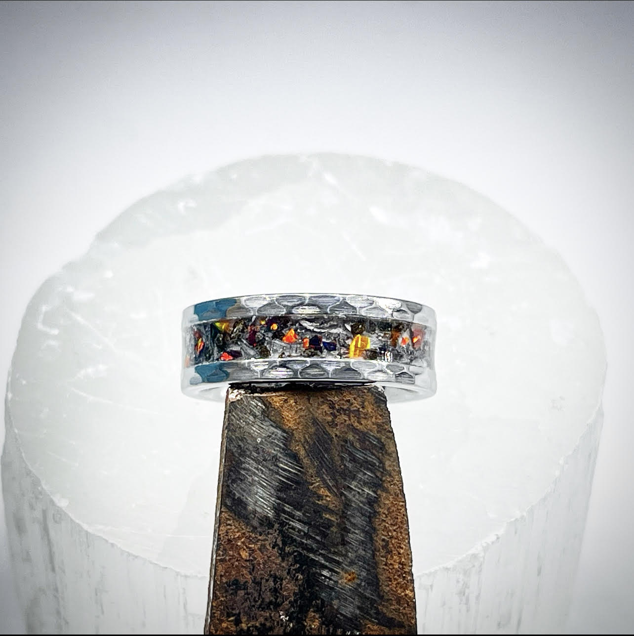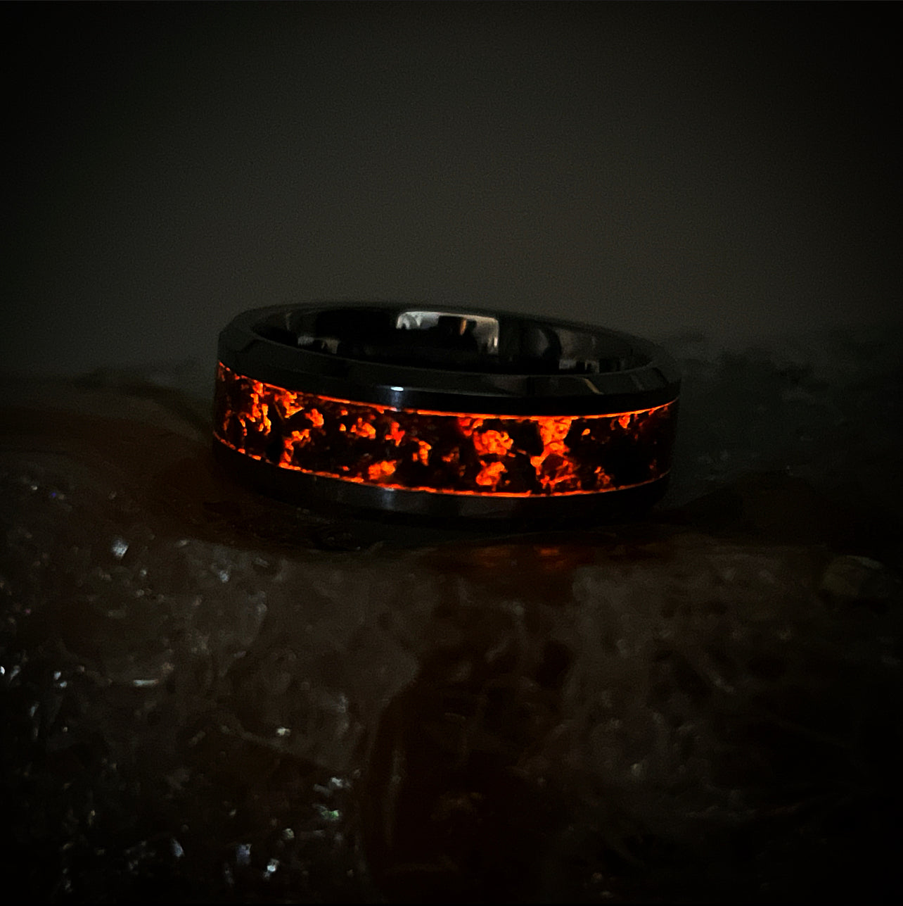 The second layer is composed of authentic fire opal, larger fragments of volcanic ash, and a blend of synthetic blood orange, crimson, and ember opals.