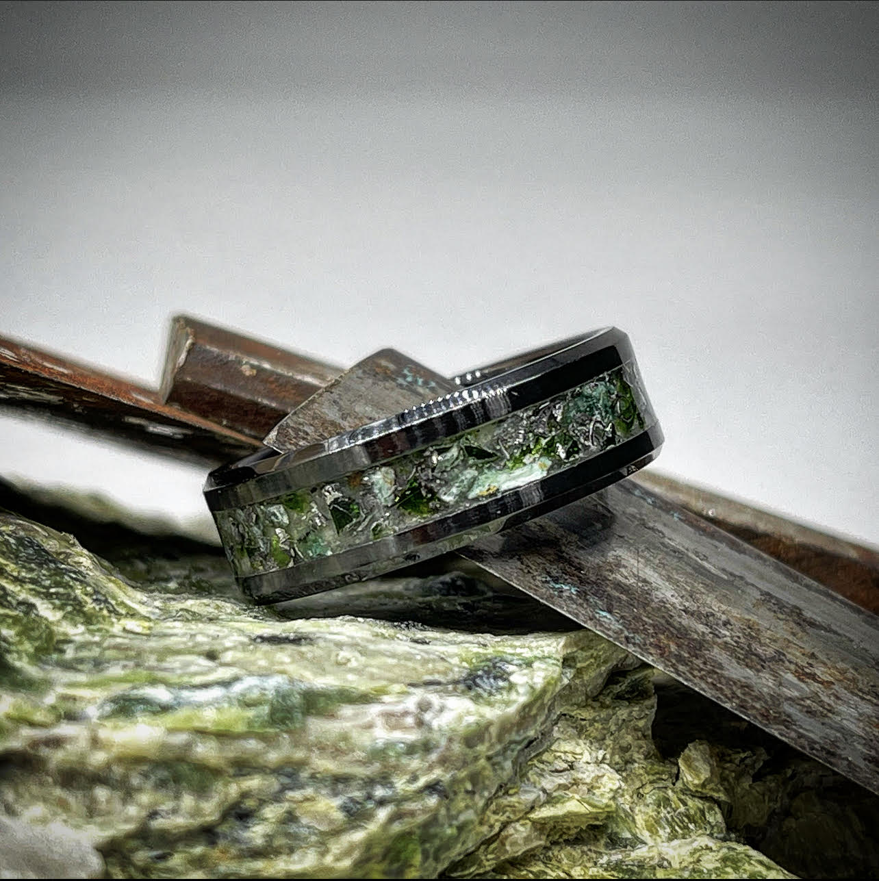 This exquisite ring named "The Aizu" contains a captivating blend of stunning gemstone fragments, rich in history and craftsmanship. The design features a harmonious combination of vibrant jade, emerald, and green goldstone, enhanced by generous amounts of authentic samurai sword shavings, dating back to the Meiji Period of the 1900s, forged in Aizuwakamatsu, Japan. To elevate its allure, each ring is accented with a soft green glow (optional), adding a magical touch to this unique piece.