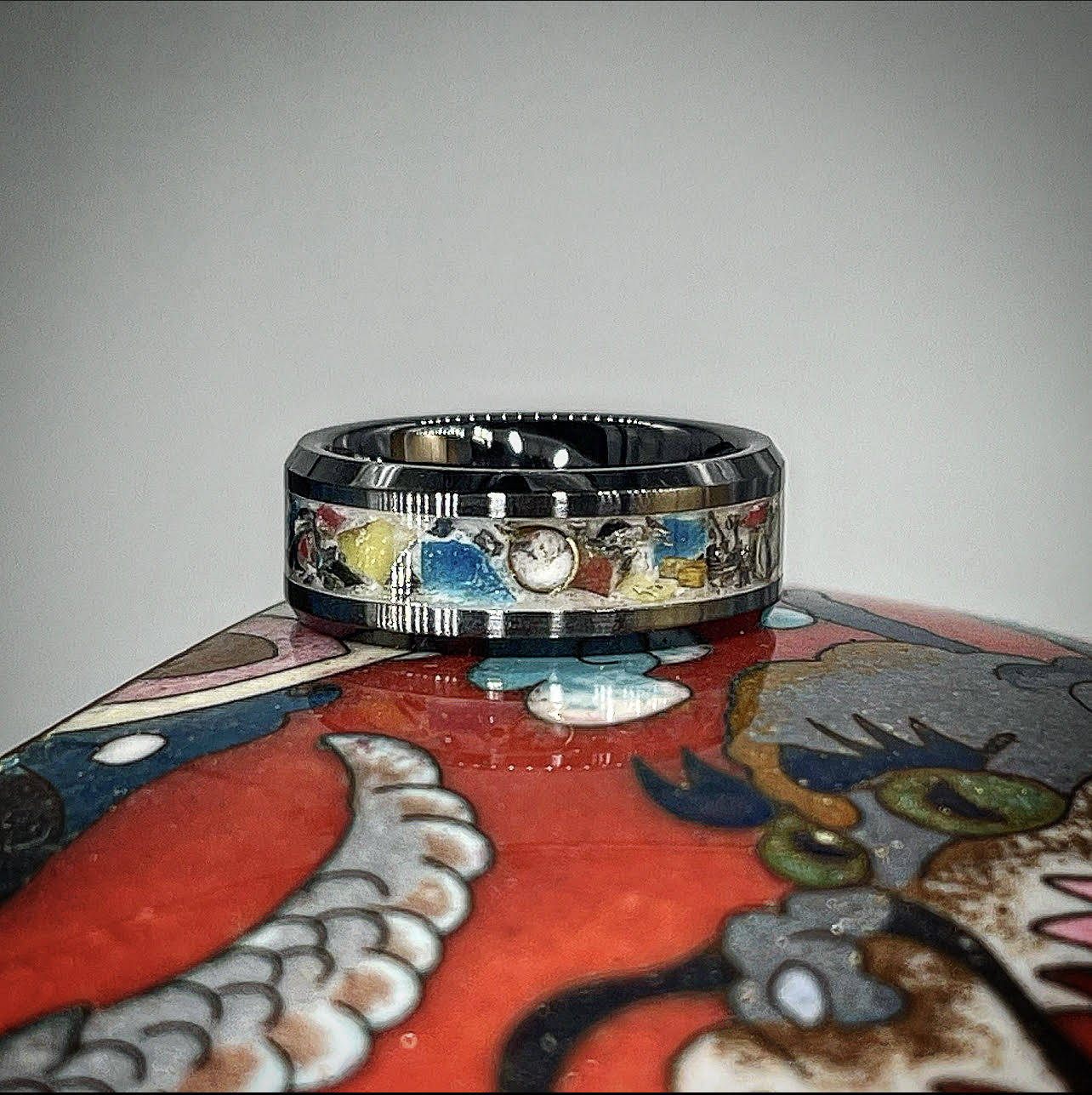 We acquired an antique Late 18th Century Japanese Cloisonné enameled vase from a local auction, damaged during transport from Japan. Rather than viewing it as broken, we saw an opportunity to let its artistry live on. The intricate Cloisonné fragments, once a part of this remarkable piece, now form the core of this limited-edition ring.